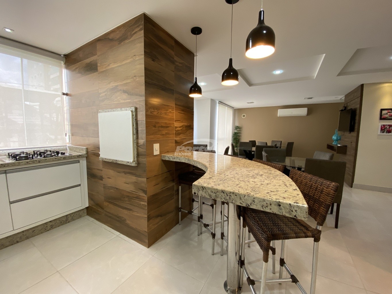 Na sacada tem deck de madeira, a churrasqueira é a carvão, na sala tem mesa de jantar, sofá e móvel sob medida do tipo escritório.
