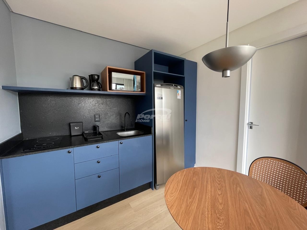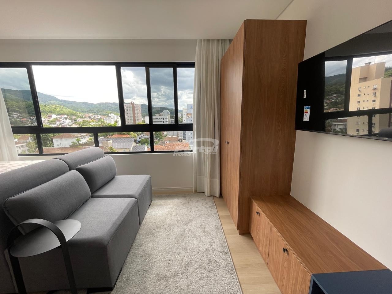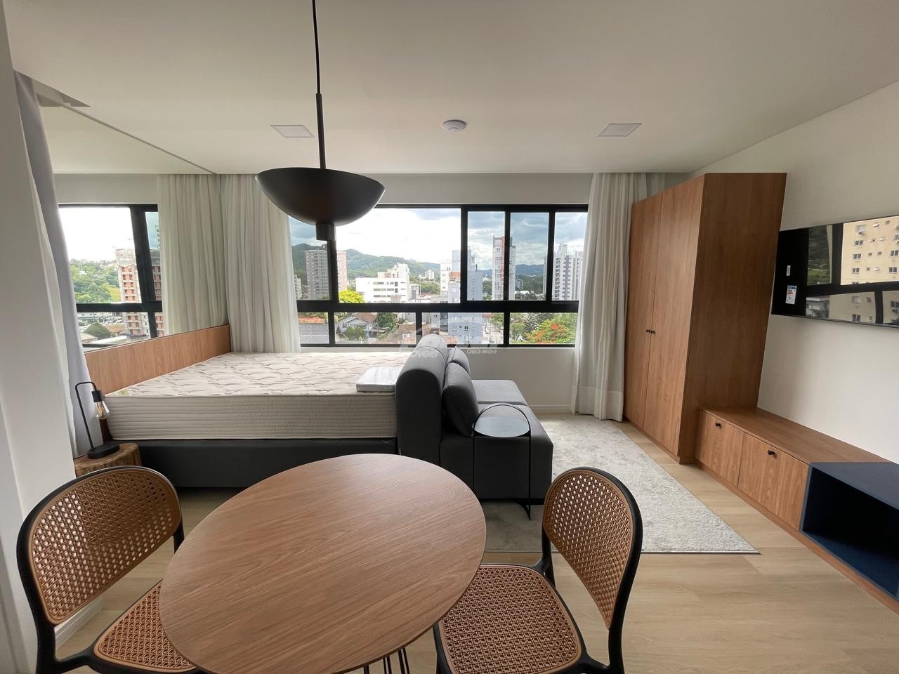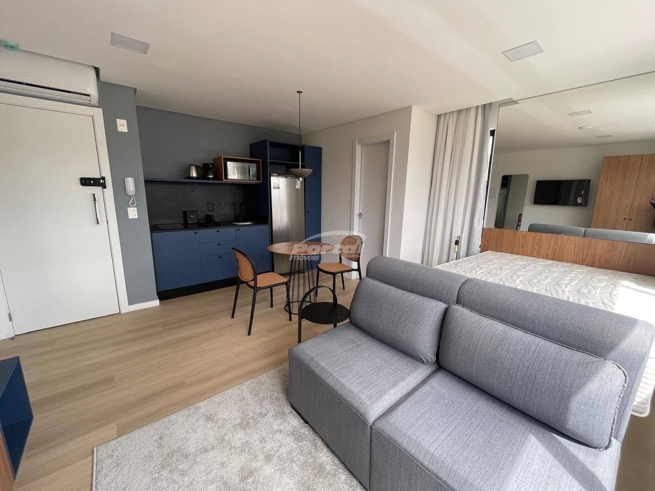 Imóvel totalmente mobiliado, equipado e decorado, com ambientes integrados entre sala de estar, cozinha e dormitório,