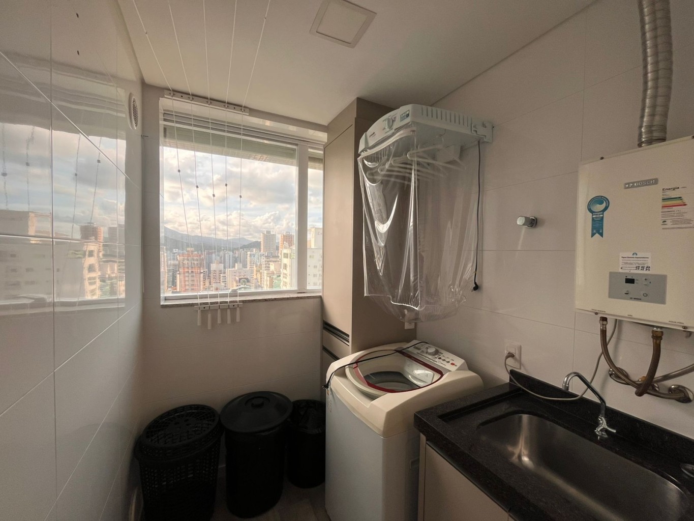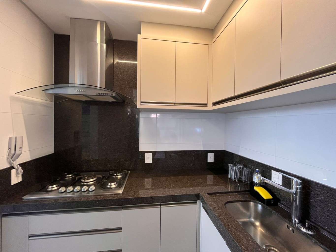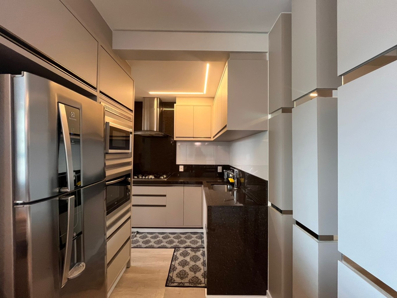 A área social se organiza com fluidez, conectando estar, jantar e varanda de forma contínua. Na sequência, a cozinha acompanha o mesmo padrão — funcional, bem equipada e discretamente integrada.