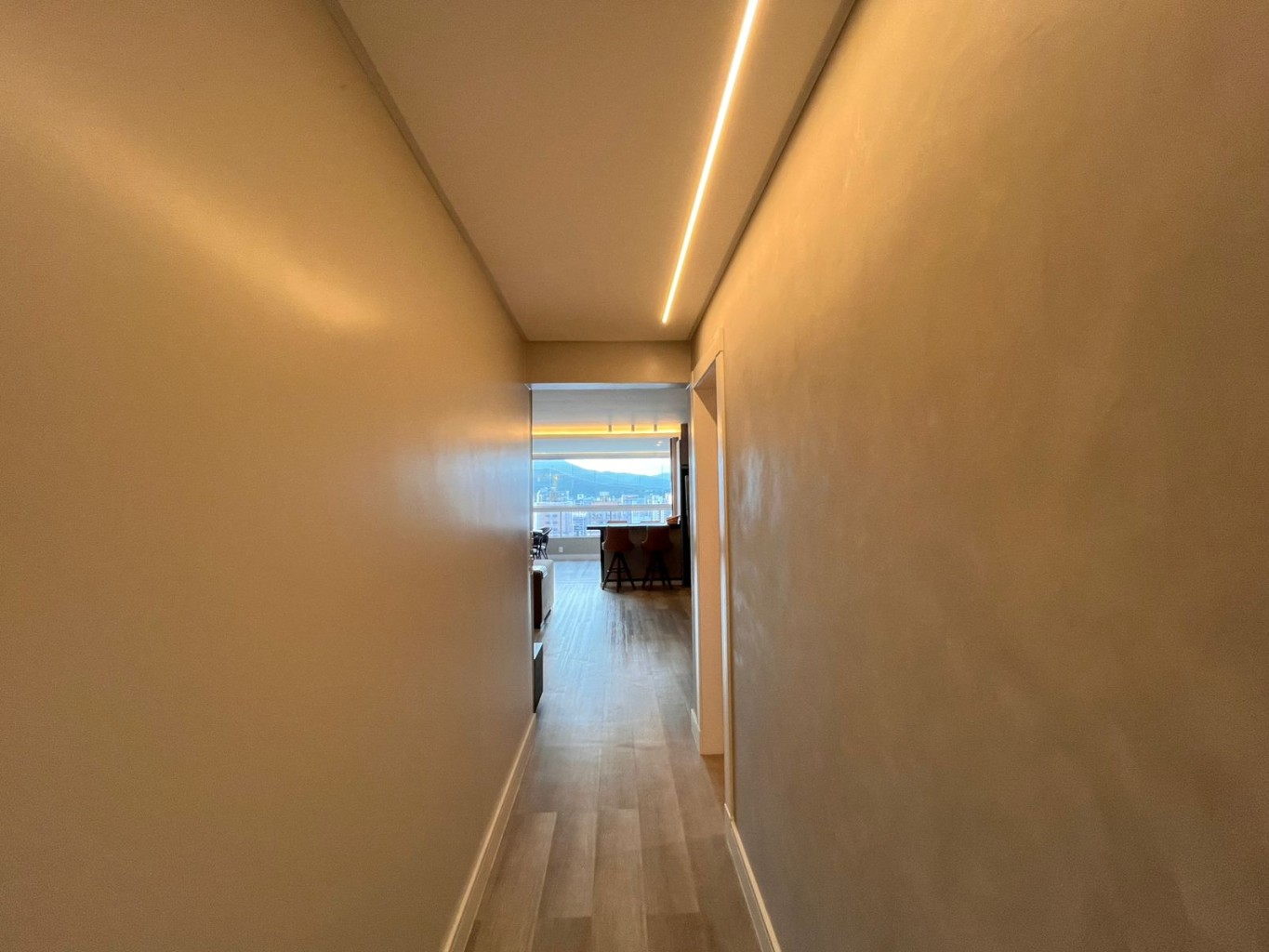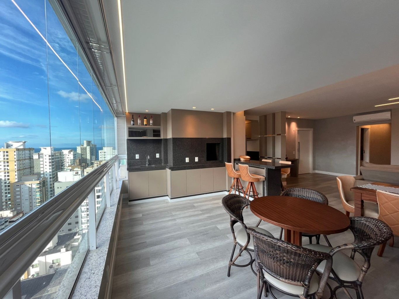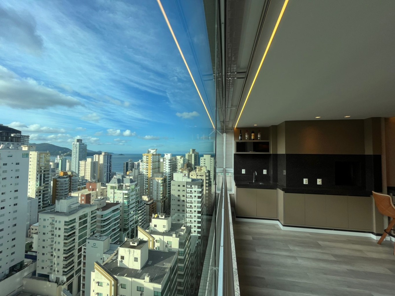 Na Meia Praia, este apartamento se revela já na entrada: a integração das áreas sociais, os vãos bem dimensionados e a luz natural percorrendo os ambientes evidenciam um projeto pensado com rigor.