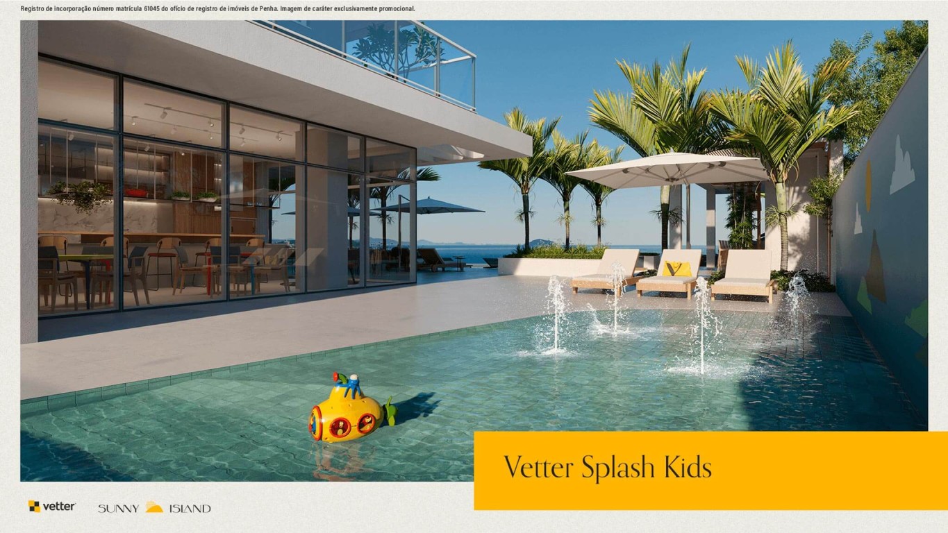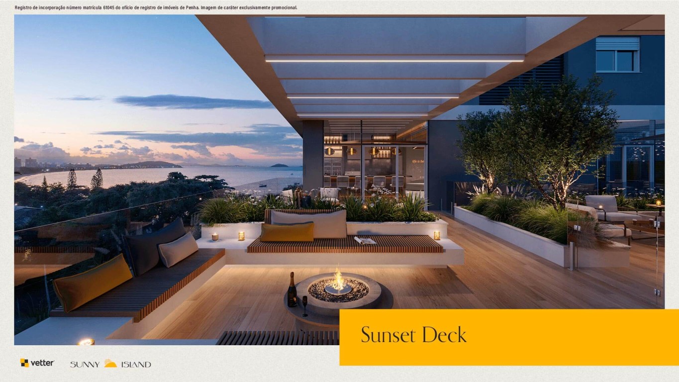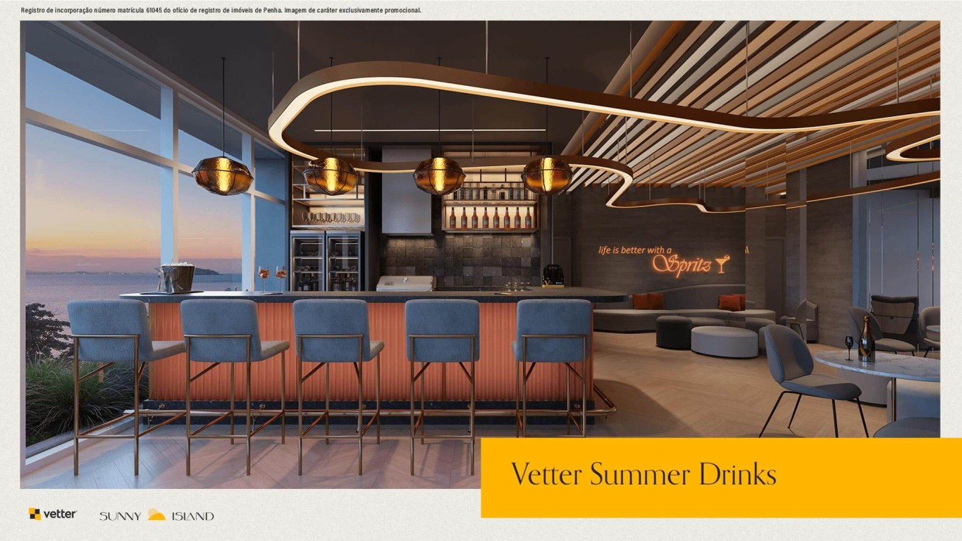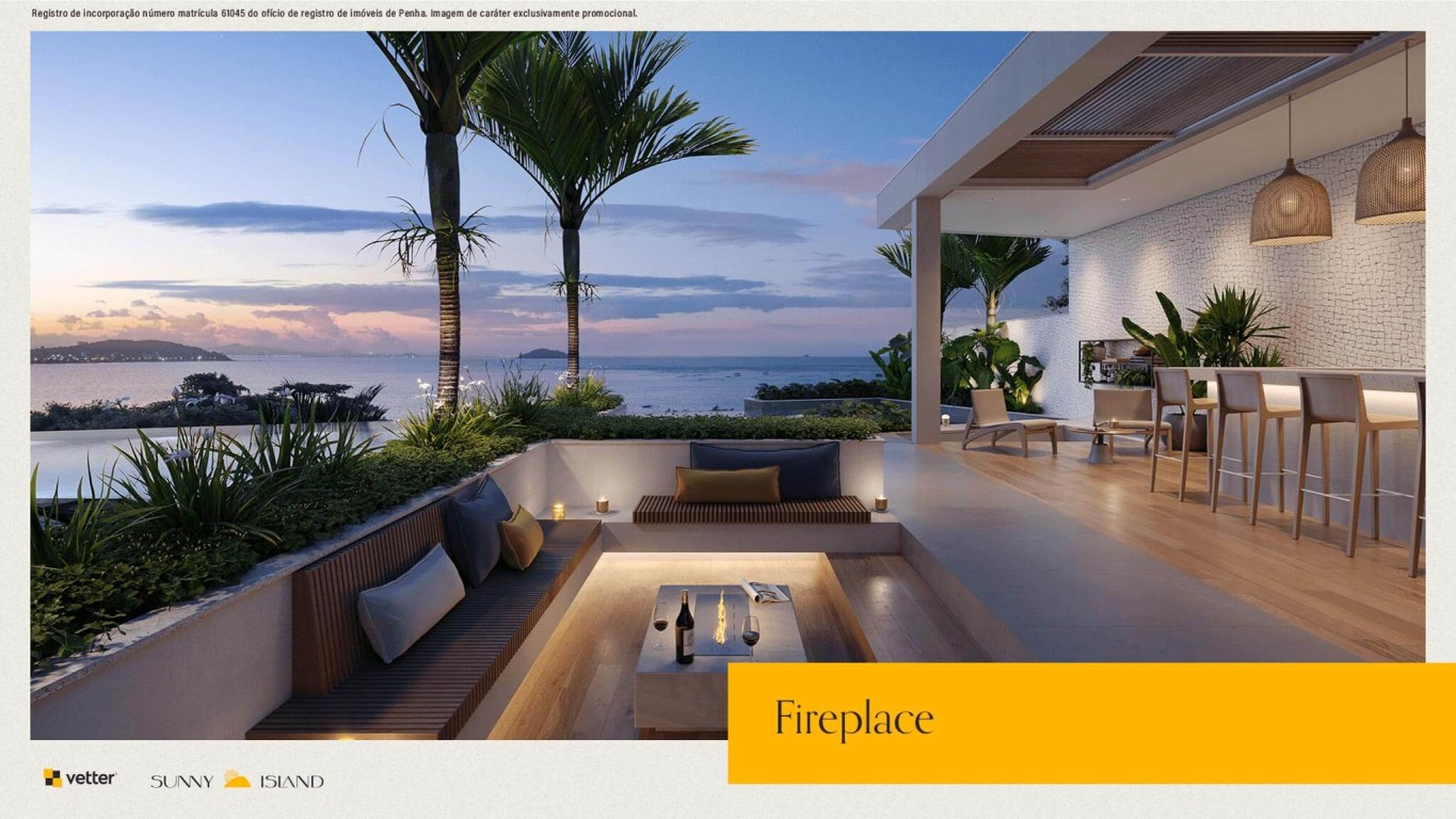 Área de lazer com mais de 1.400m², piscina com borda infinita e vista para o mar, 2 salões de festas, deck molhado, deck externo, fireplace, bar molhado, vetter grill e beer, splash kids, redário, horta comunitária, playground, pet place, quadra poliesportiva, sports grill, fireplace sunset, deck sunset, brinquedoteca, reebok fitness center, vetter summer drinks, game room, business and coffee, vetter bike community, game center, cinema.