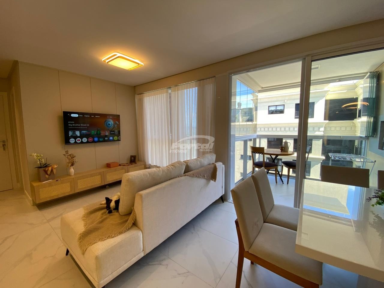 Apartamento de aproximadamente 140m² possuindo 3 suítes, sala de estar e sala de jantar conjugadas, sacada integrada com churrasqueira, área de serviço, lavabo, duas vagas de garagem e box privativo.