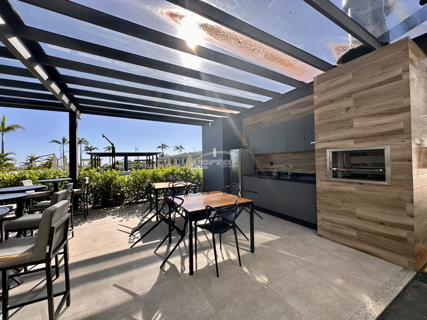 03 suítes, cozinha americana, área de serviço, lavabo, sala de estar, banheiro social, sacada integrada, churrasqueira, piscina privativa e além disso conta com 2 vagas de garagem.