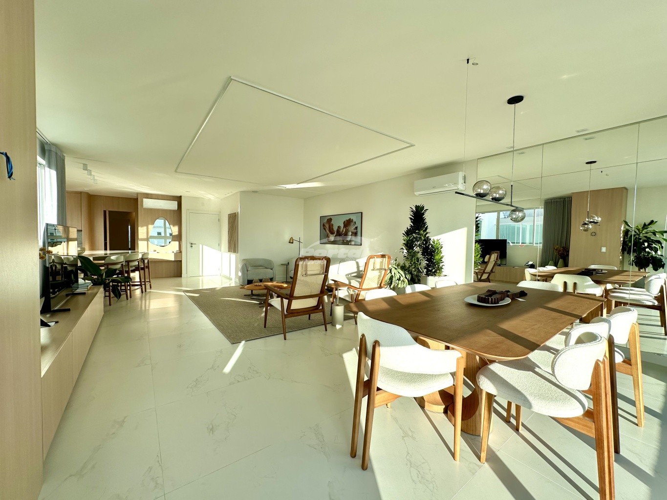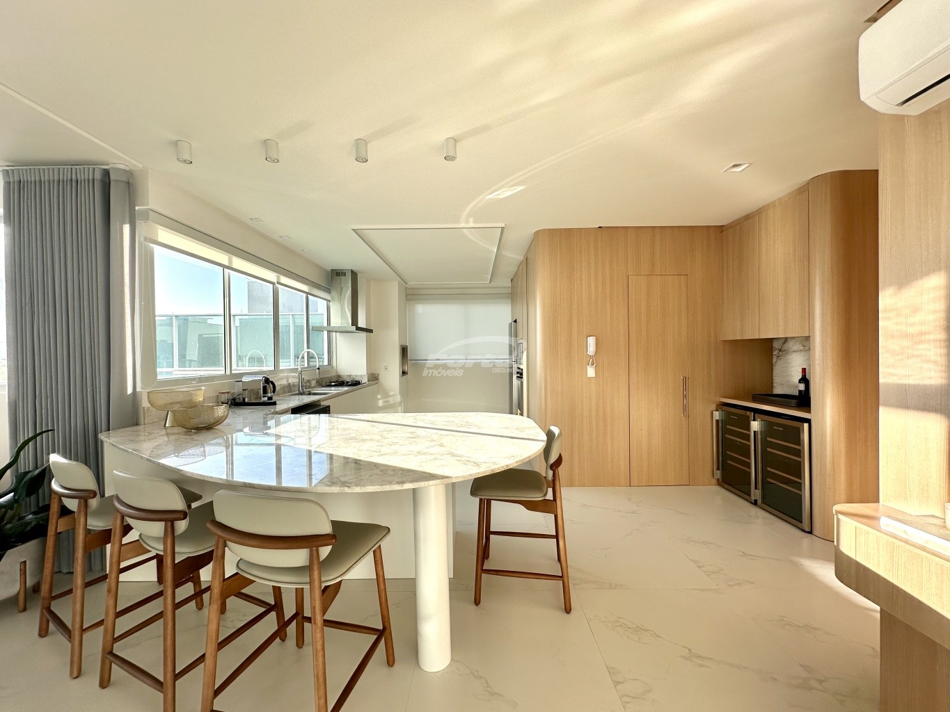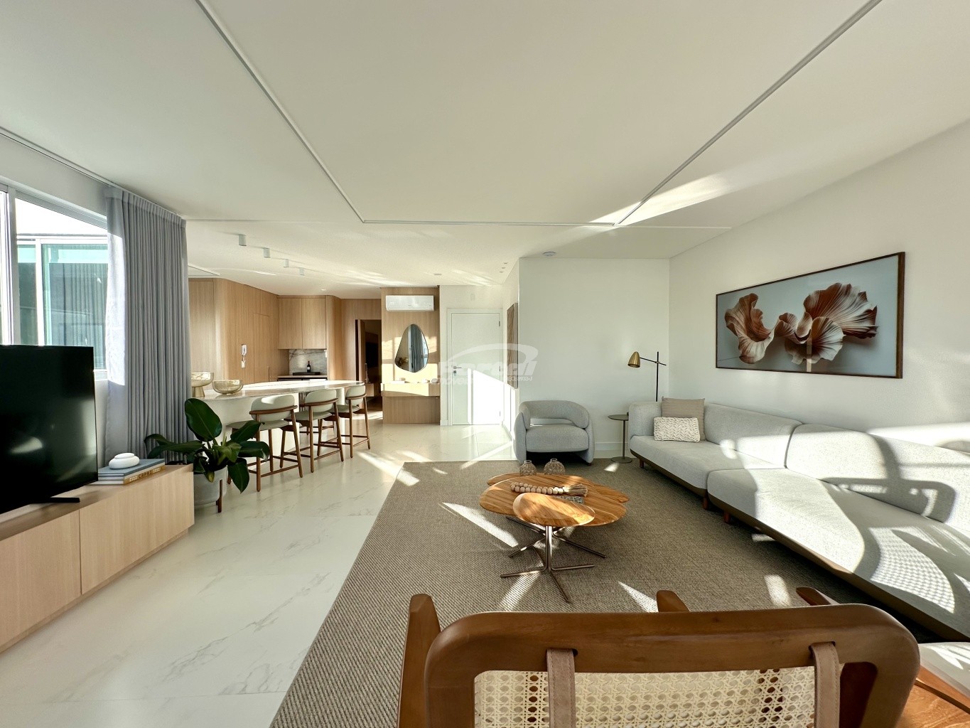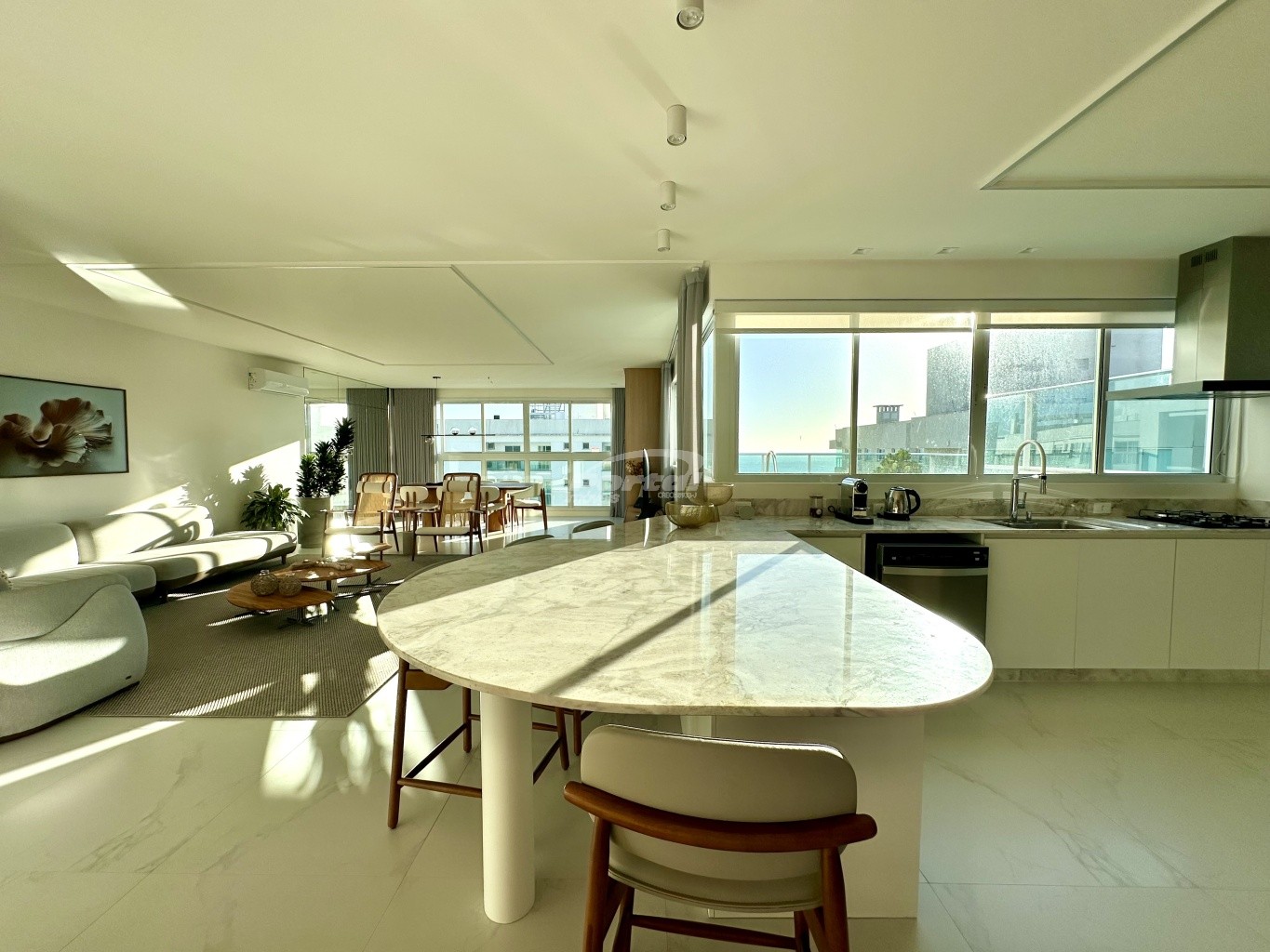 04 dormitórios, sendo 2 suítes, cozinha americana, área de serviço, lavabo, sala de estar, banheiro social, sacada integrada, churrasqueira, piscina privativa e além disso conta com 3 vagas de garagem.