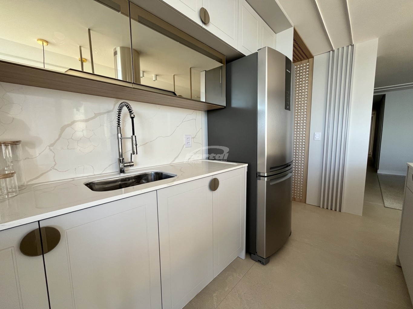 Hall de entrada decorado, elevador, infraestrutura para ar-condicionado split, medição individual de água, luz e gás, sistema de segurança e controle de acesso, vagas de garagem privativas, padrão de Acabamento, porcelanato nas áreas sociais, piso laminado nos dormitórios, rebaixo em gesso, portas internas brancas, esquadrias em alumínio, churrasqueira a carvão nas sacadas, nichos nos banheiros