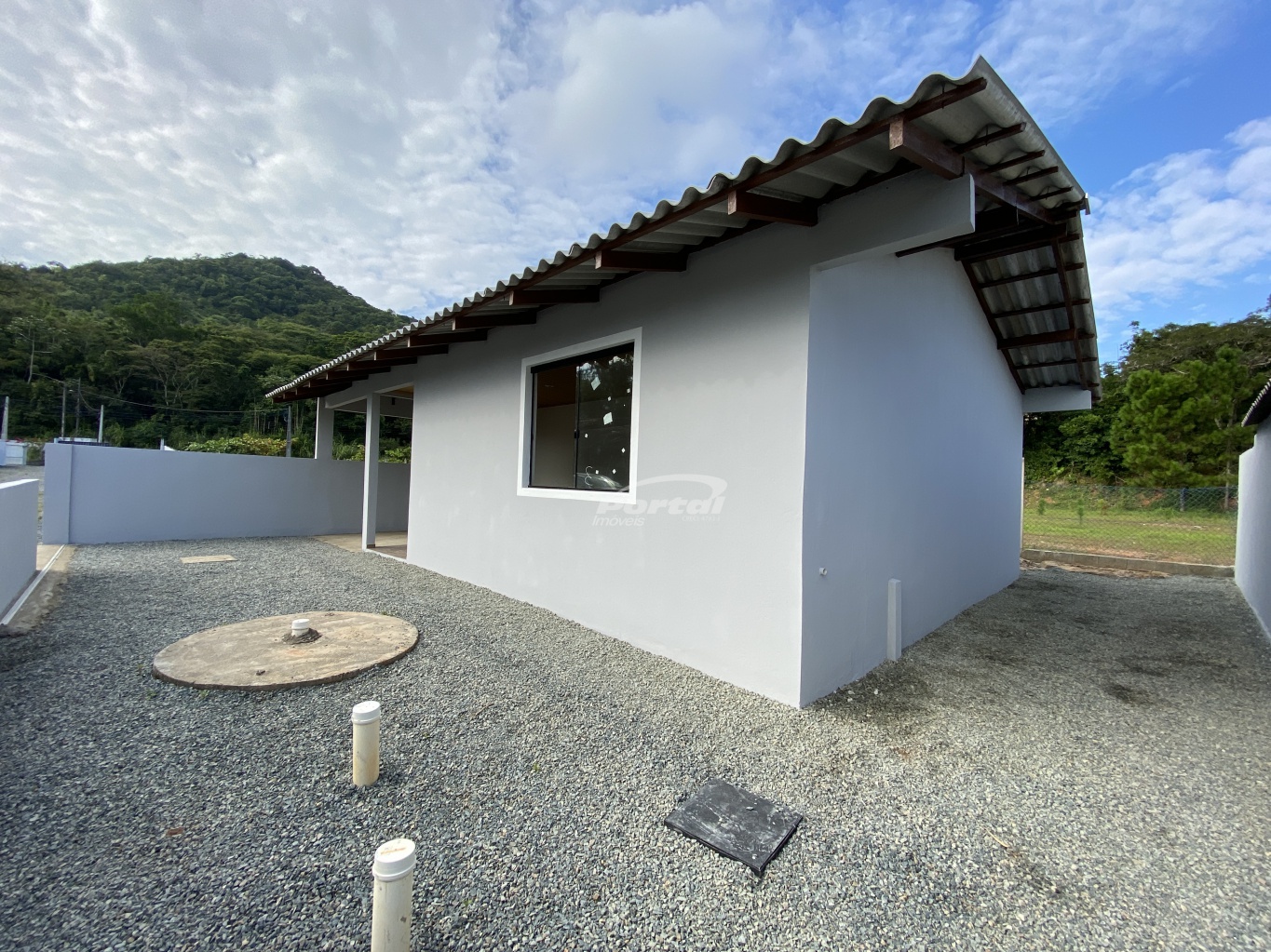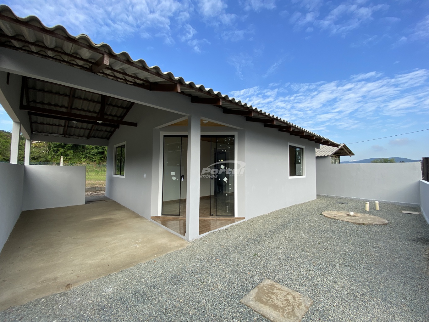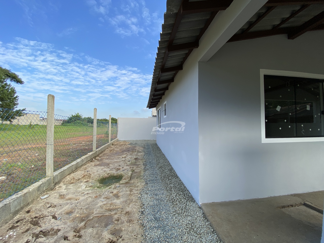 Imóvel com 2 quartos, sala e cozinha conjugada, banheiro social, área de serviço, garagem e amplo terreno;